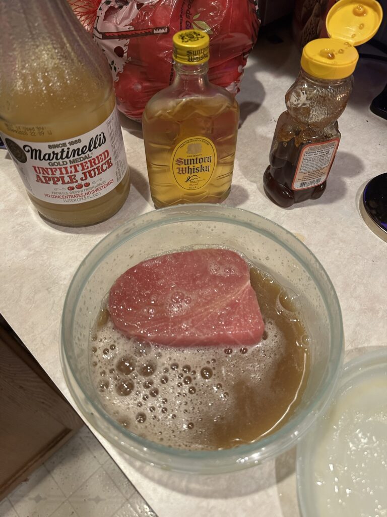 So I modified a simple apple juice and citrus marinade! To soak the tuna in! Damn good!