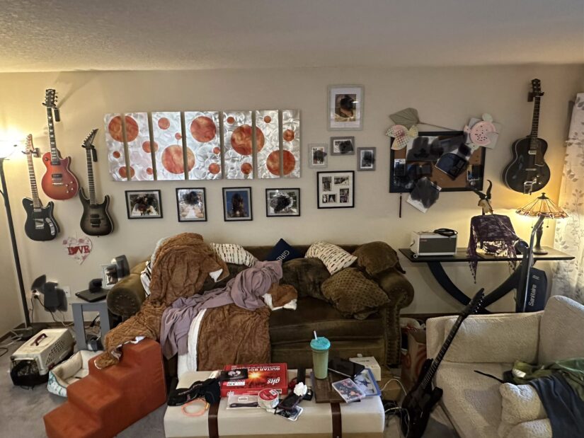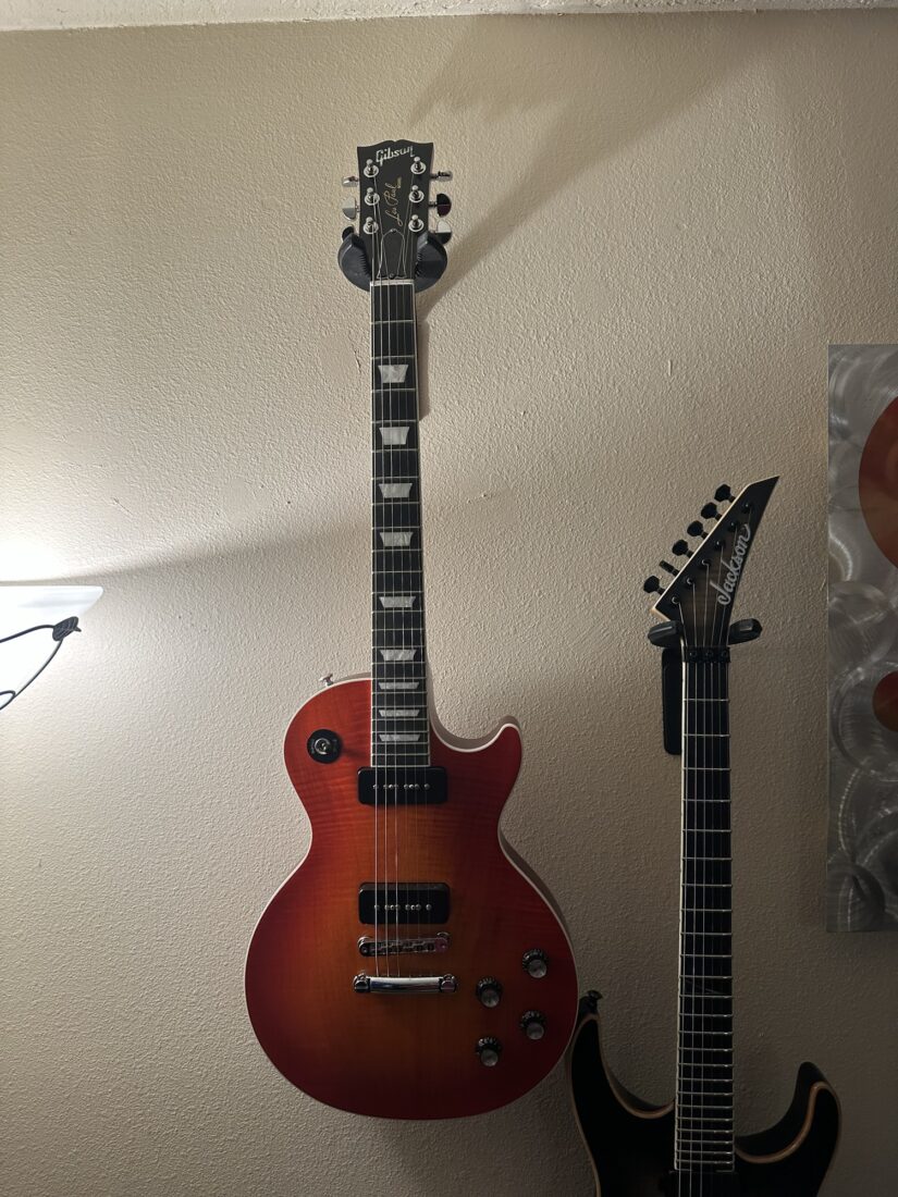 And 2 more guitars to hang! Then almost ready to get the carpets cleaned! Lay down the new oriental rugs and homie is done with this room!