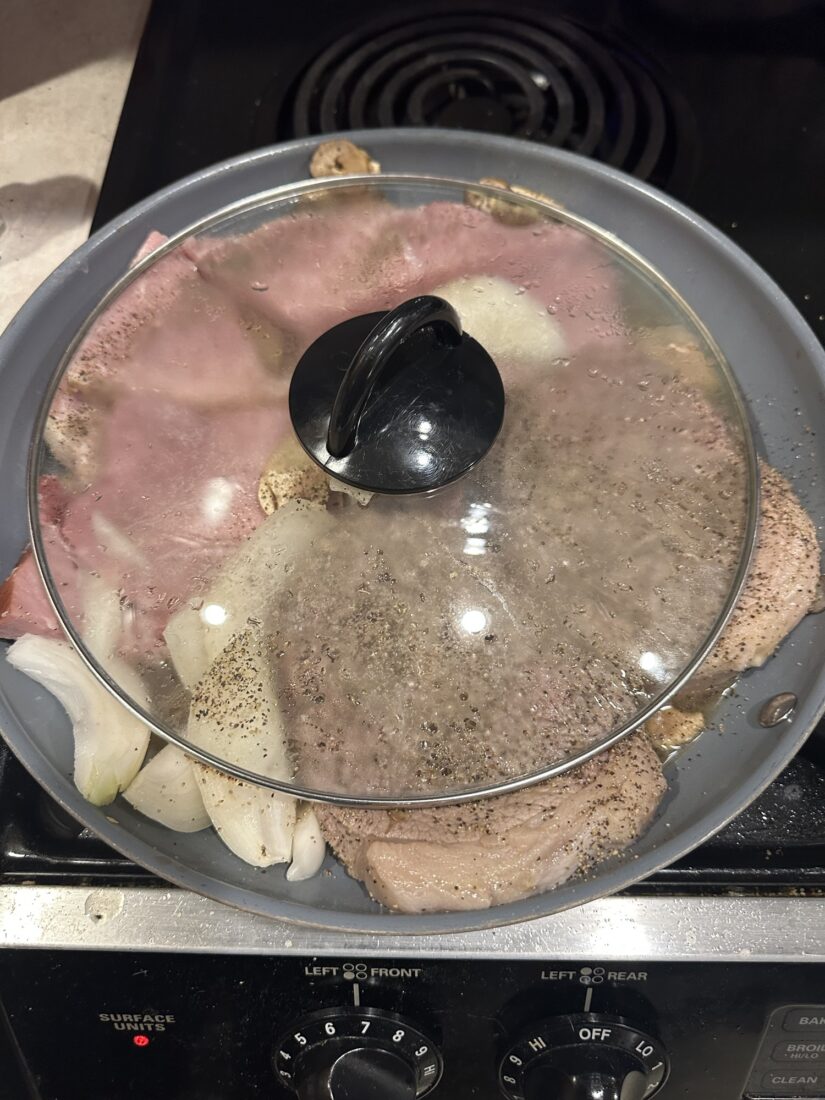 So we got steak, ham, onions and shrooms! red baked potatoes are in the microwave! 4 minutes and they will be done!