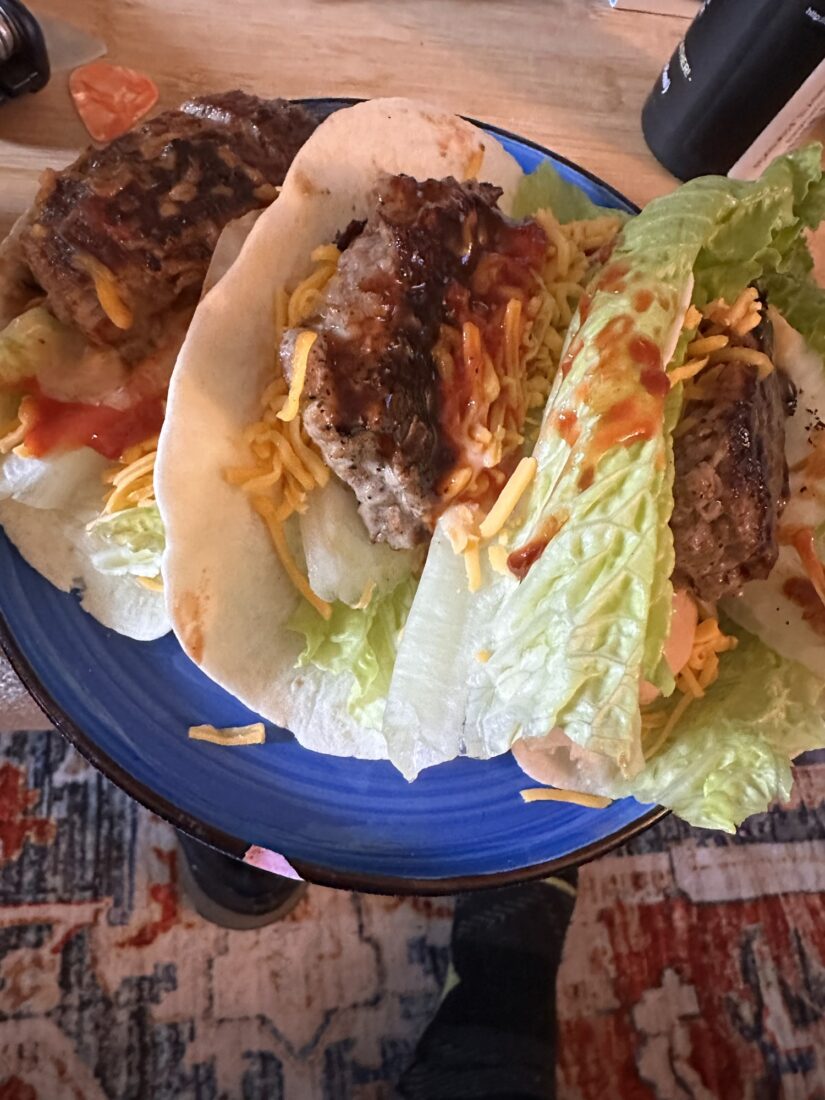A tortilla with Romain lettuce, onion and cheese! Burger cut in half and wrapped like a soft taco! Mmmmmm!