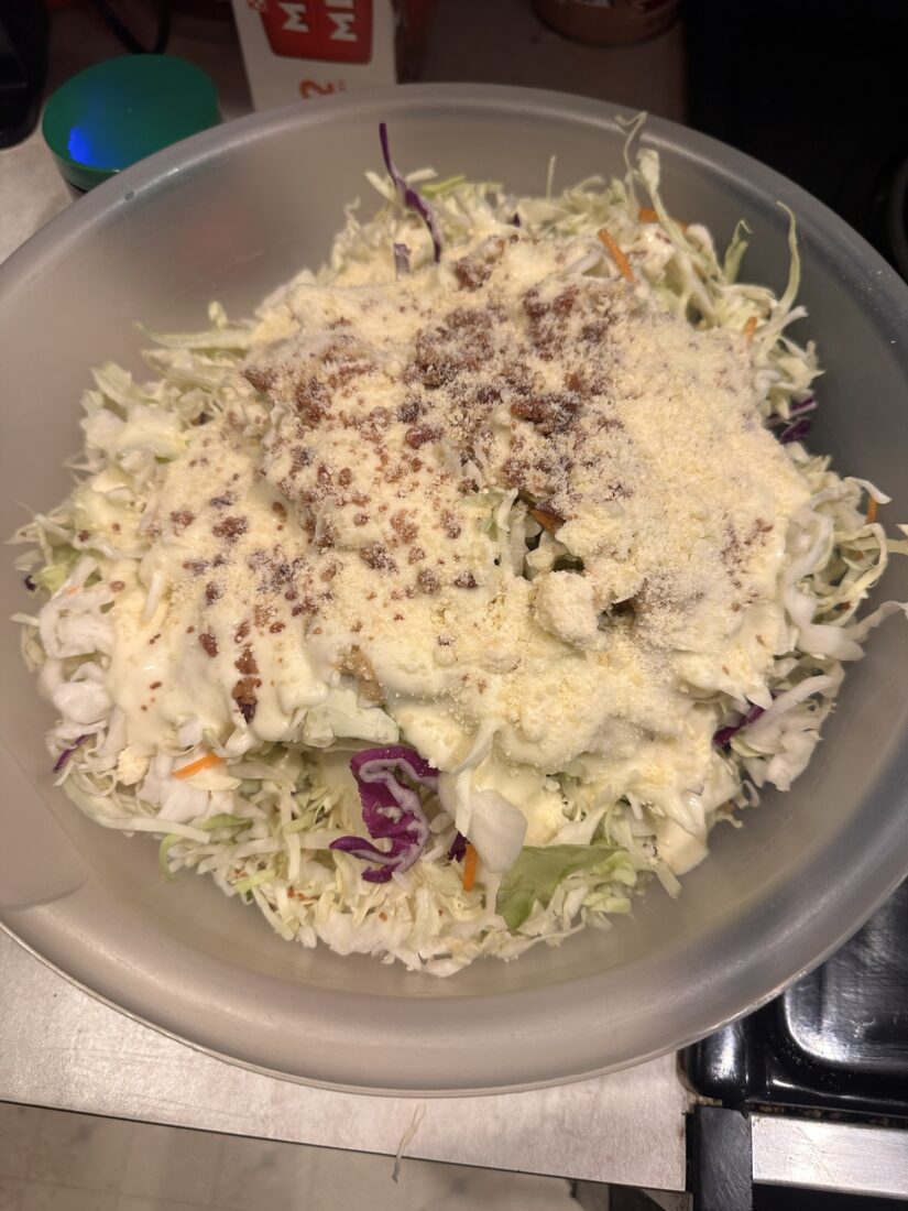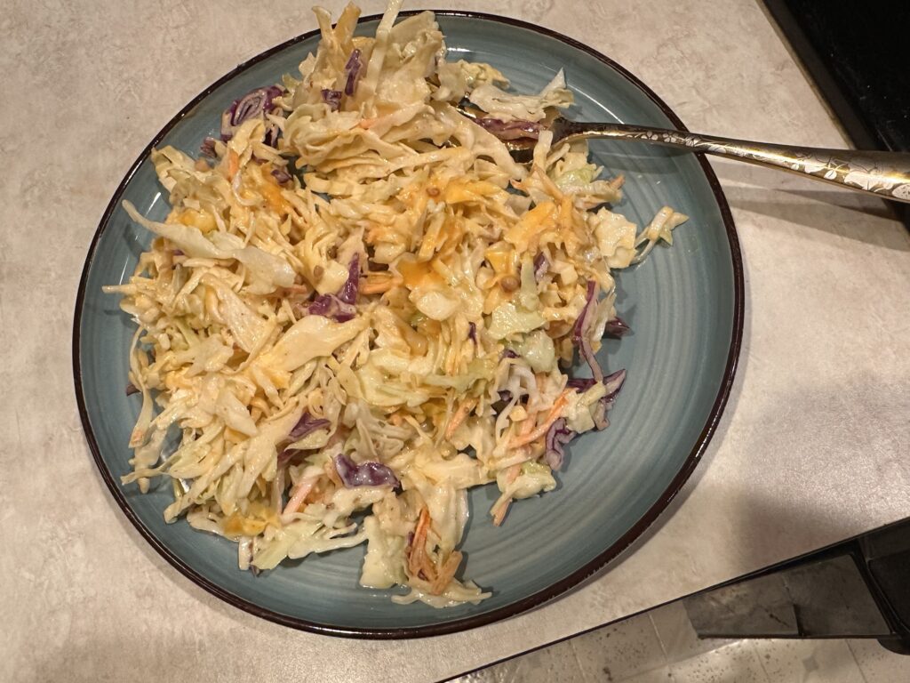 Today I’ll be using half a bottle of skippers slaw dressing with a couple tablespoons of Cindy’s kitchen, Cajun Remoulade! With 2 bags of slaw with color!