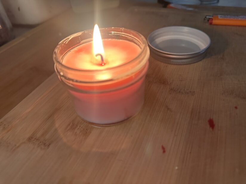 I now know I can’t use these wicks! They put of puffs of black smoke on occasion! That’s not acceptable! I also know that 1 eye dropper of scent doesn’t give off enough good smelling stuff for my acceptability!
