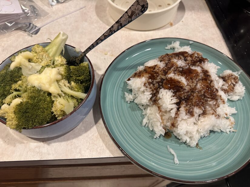 Steamed broccoli and jasmine rice with teriyaki glaze….