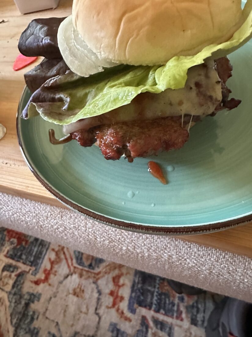 Melted Swiss cheese with ketchup and a peach bbq sauce. Roasted onion and live red leaf lettuce! Omg I ate 2 and dinner ain’t even done yet…..