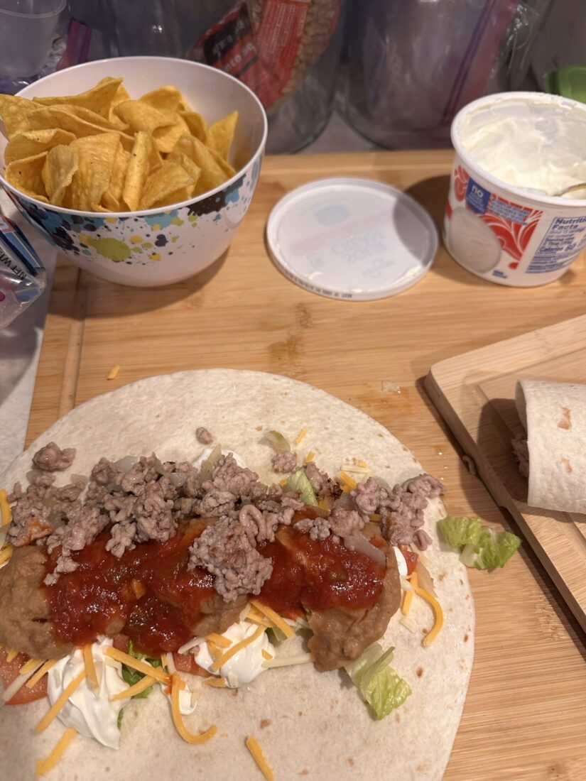 Fresh tomatoe onion, Romain, sausage, refried and cheddar!
