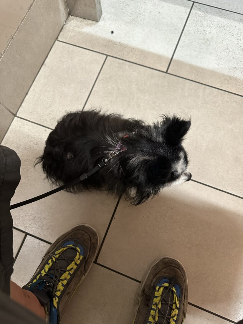 With it! I tried telling the store clerk my dog was a service animal! That she is my seeing eye dog!