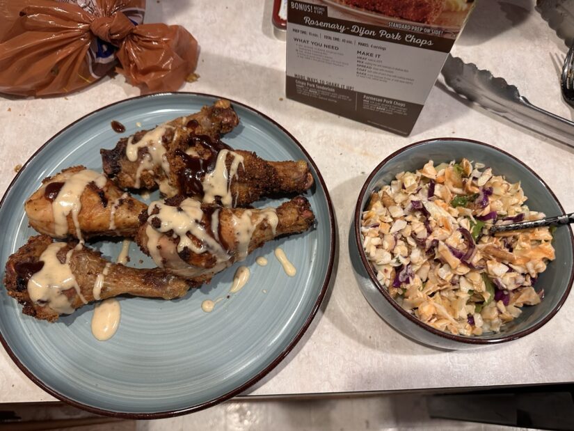 Dinner is served! An an Asian orange “ something “ salad kit. With a side of authentic shake and bake chicken legs drizzled in a garlic ranch and bbq sauce…..