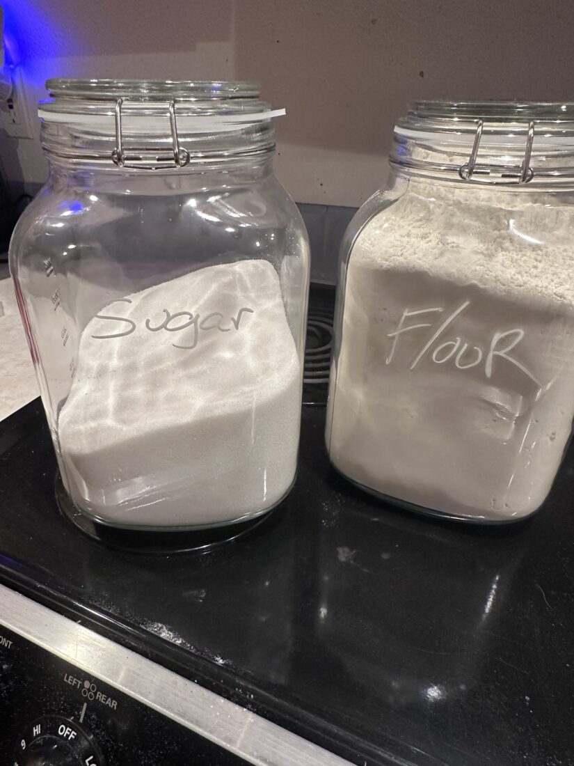 Then after last nights ant ambush. I found these 1 gallon sealed lid, wide mouth jars to put sugar and flour in! Oddly they included a white grease pen to note contents with! 🙂