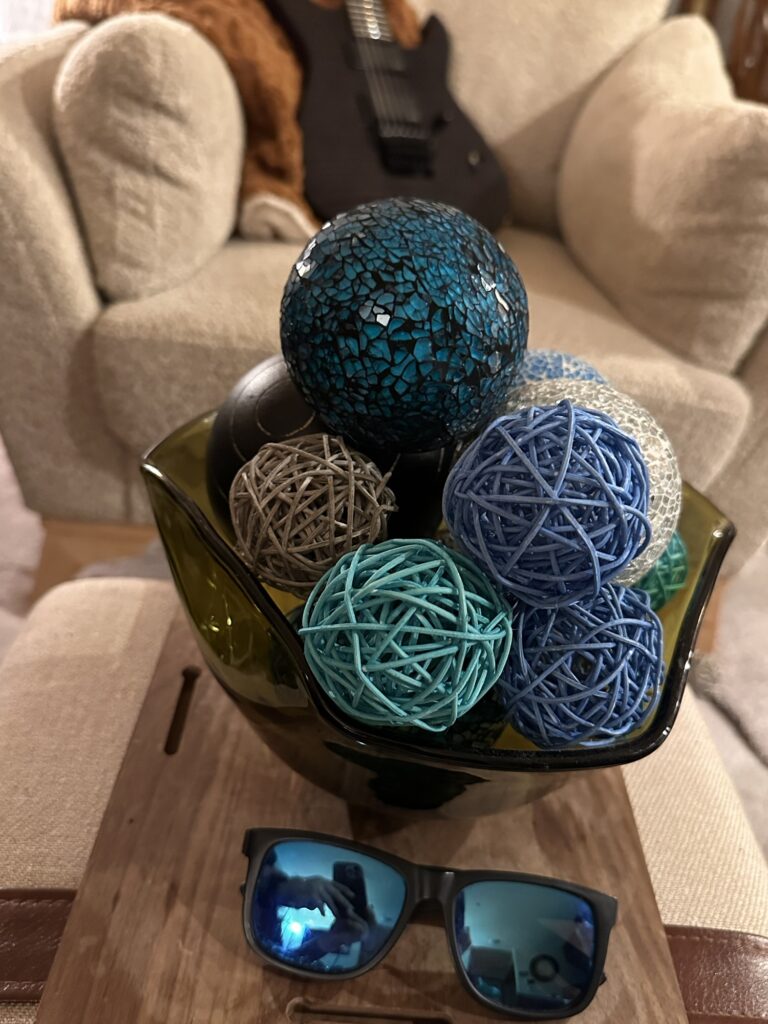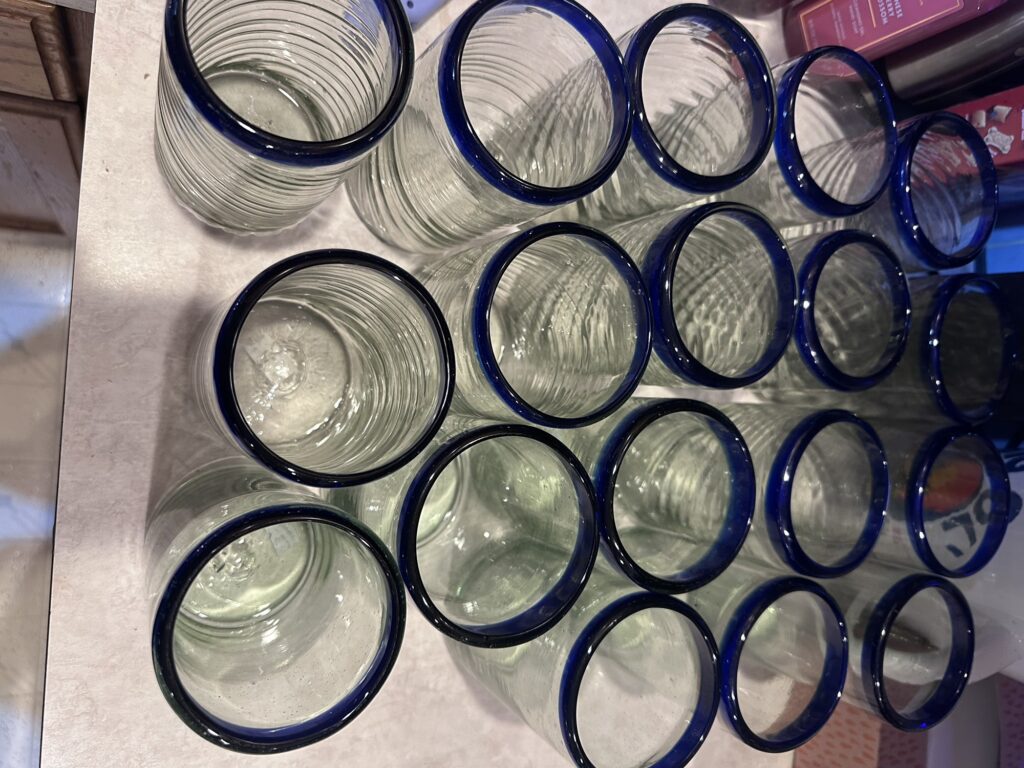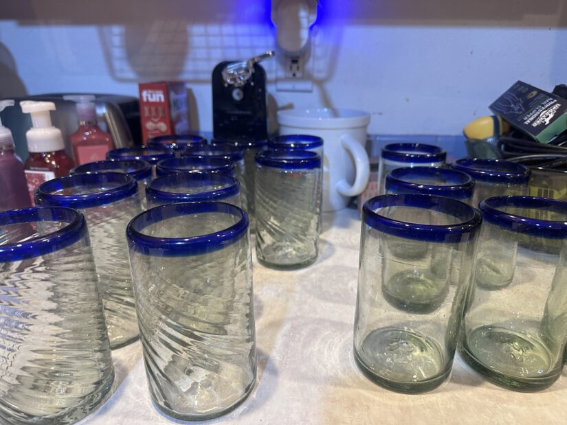 The glasses, oh my goodness are each pieces of art! Each one hand blown glass. All different from the next! Found 16oz glasses 6 for $15 bought 2 of those sadly! Should have bought more! 🙁 for presents!! While adding a 24 oz set for the thirsty! Size difference distinguishable by design or lack of!