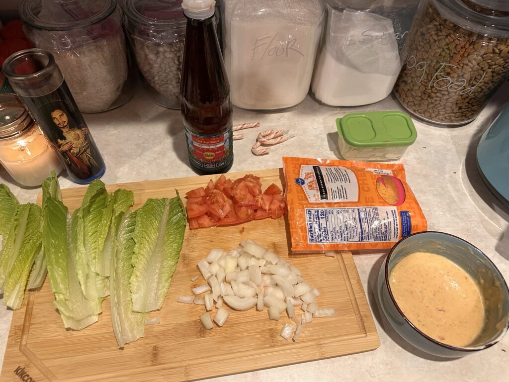 Romain hearts, chopped onion, chopped tomatoes, cheddar cheese, a splash of light soy sauce, and a drizzle of sweet chili sauce, thousand island dressing and mayonnaise…..