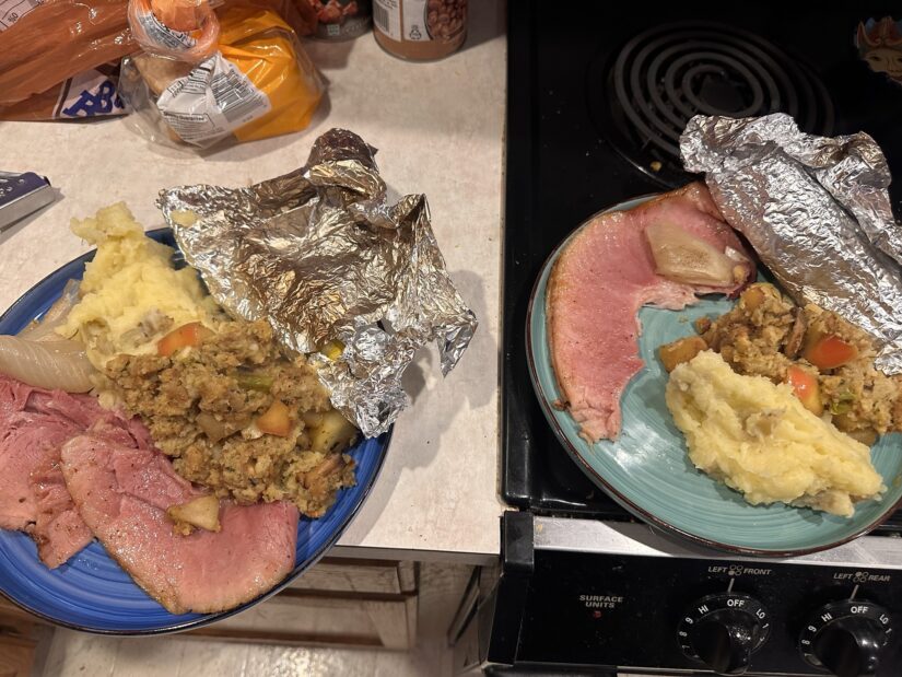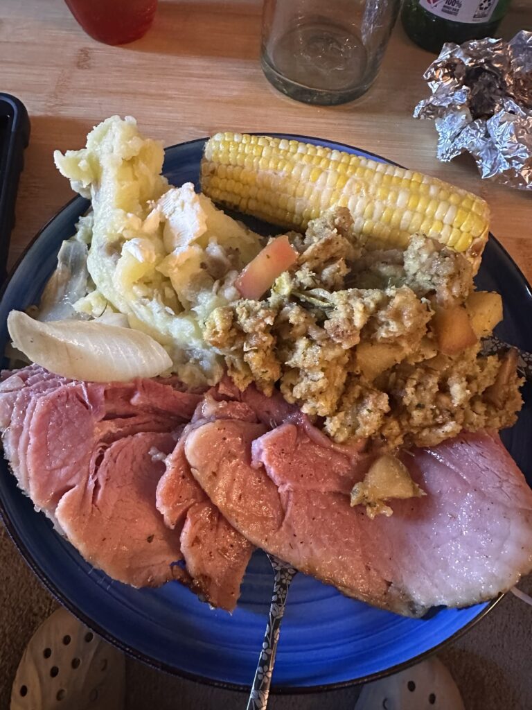 The white potatoes hand mashed with skins on, killer! Coleslaw, killer! Maple and honey spiral ham, killer! Bbq corn, killer!