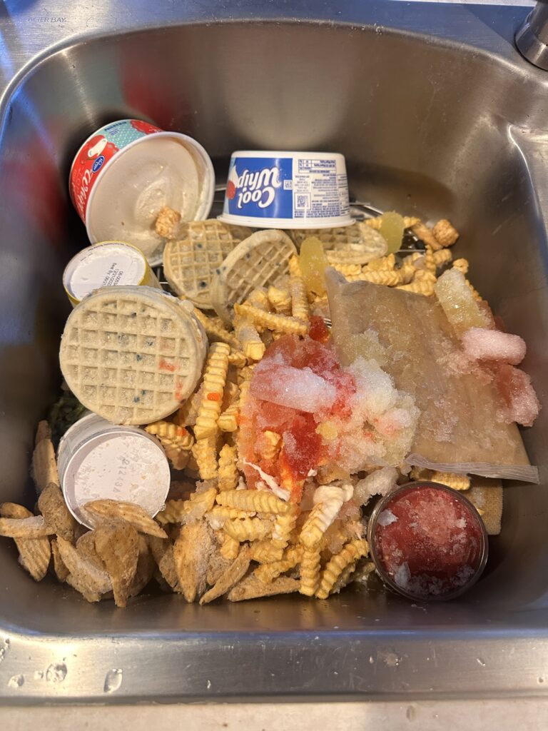 While the garbage disposal will eat all this shit later after it defrosts! The lady had a problem with partial eating of food and leaving the rest in the freezer for years!
