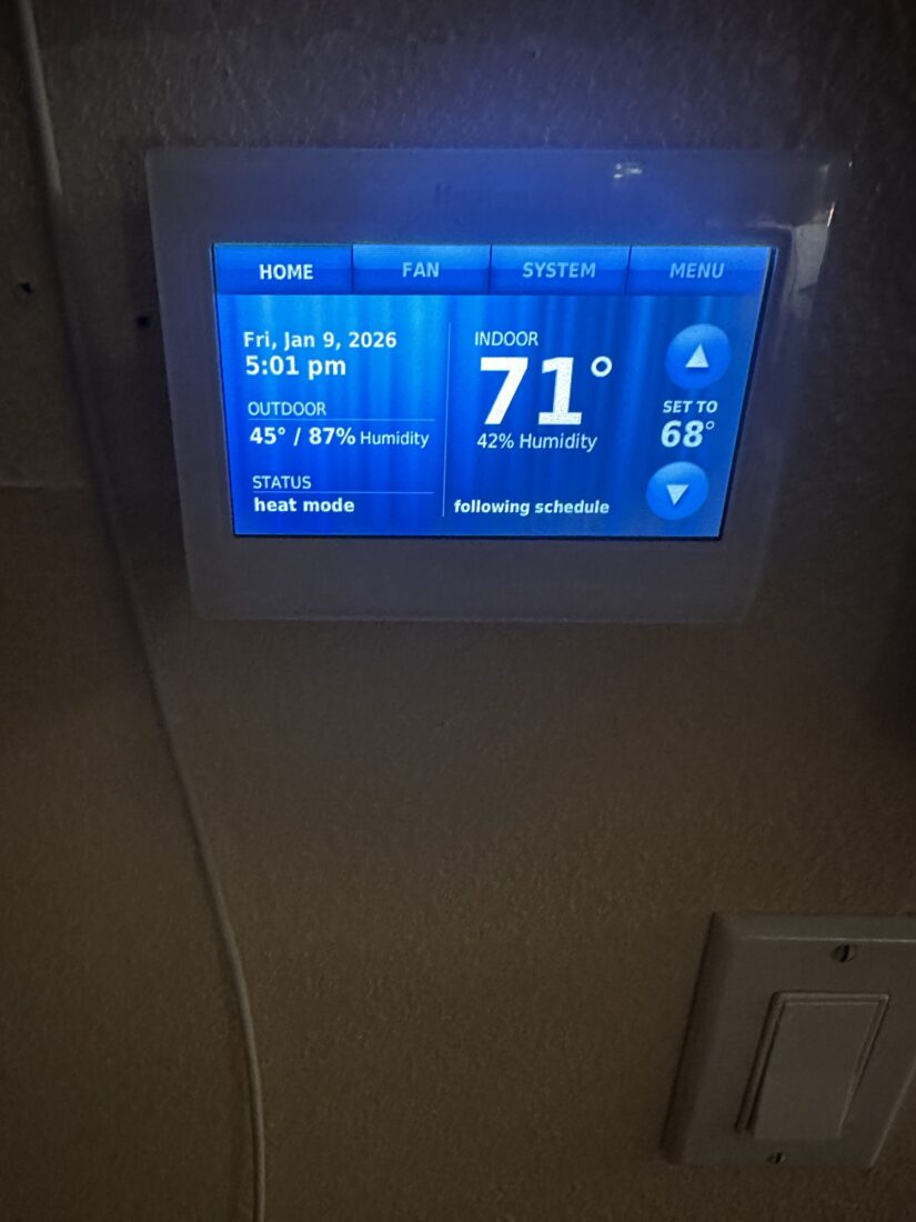 When I sleep I’ll let that temp drop to 67-68 degrees! Perfect sleeping temp along with minimal furnace usage…..