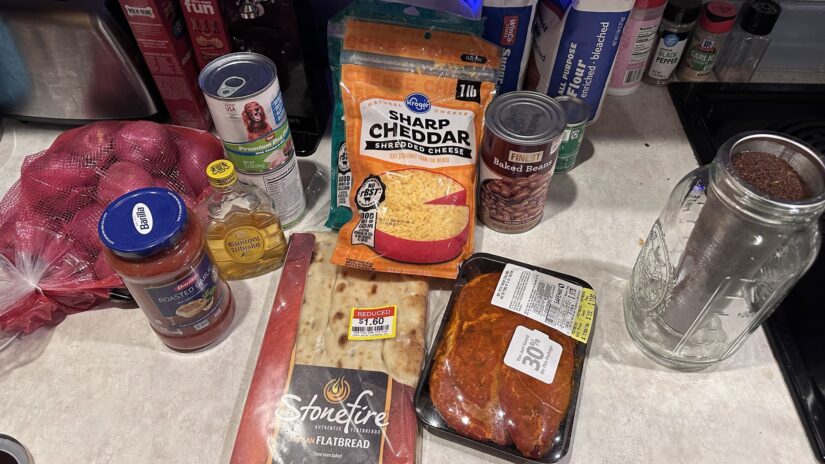Steak pizza with onion, on flatbread with baked beans and a couple red potato’s!