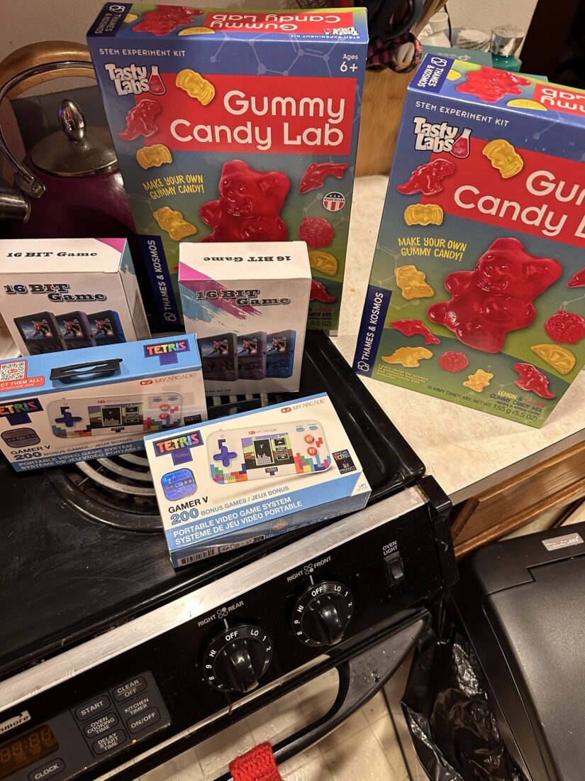 For Xmas presents to my nieces and nephews? This year each get a handheld retro game thingy! While the family gets a build a gummy bear kit to do together!